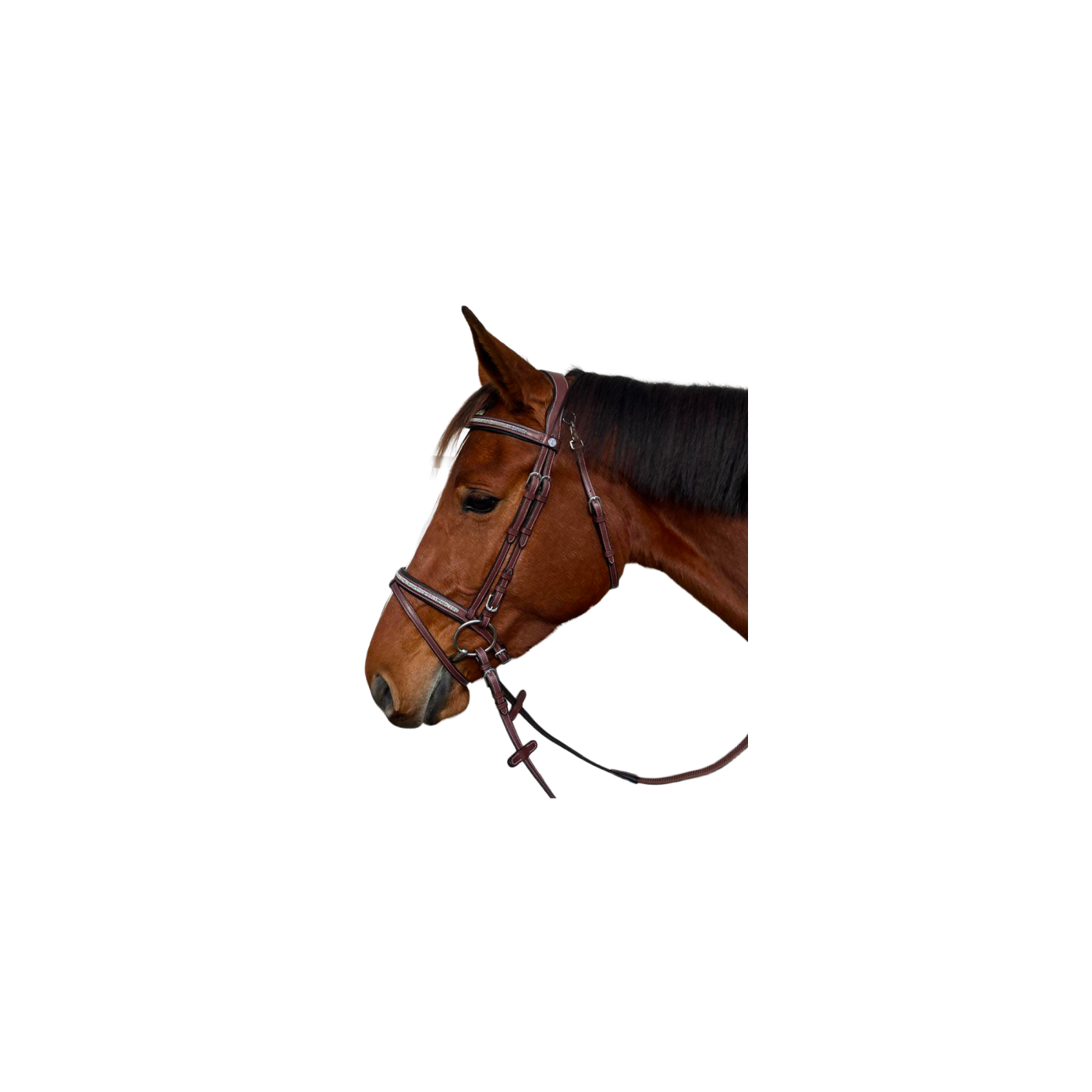 Le bridon Aachen possède un frontal et une muserolle brillants doublés. Sa têtière anatomique doublée apporte du confort et on retrouve une bouclerie en inox gravée F&C. Vendu avec les rênes caoutchouc eventer.