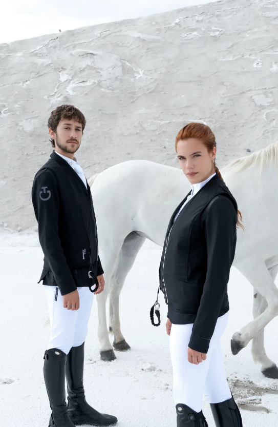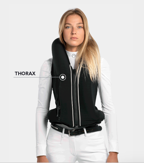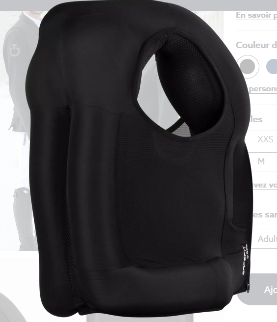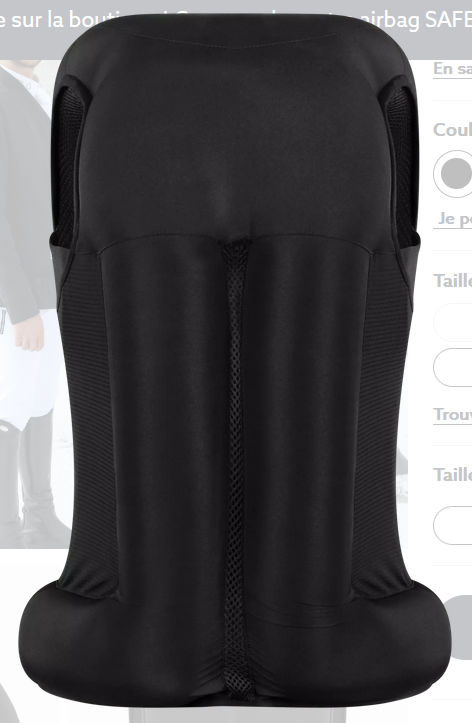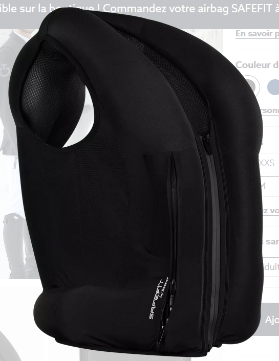 SAFEFIT peut se porter en dessous d’une veste de concours compatible airbag de toute marque. Cette dernière doit alors comporter un minimum de 15% d’élasthanne dans sa composition.
