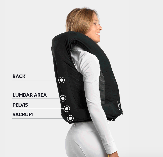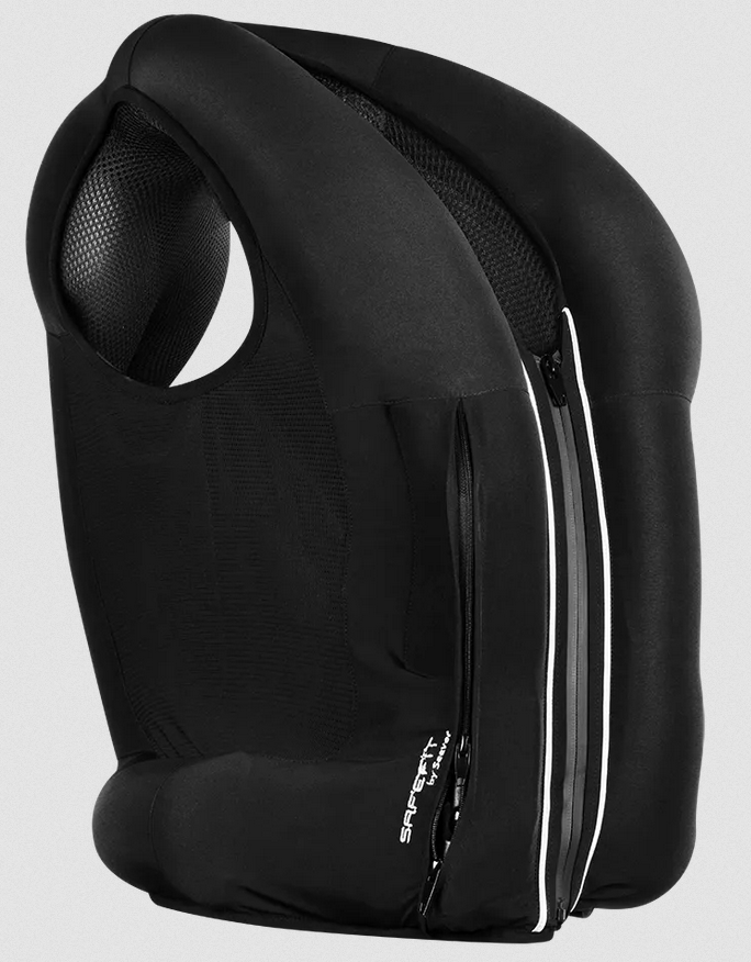 SAFEFIT peut se porter en dessous d’une veste de concours compatible airbag de toute marque. Cette dernière doit alors comporter un minimum de 15% d’élasthanne dans sa composition.