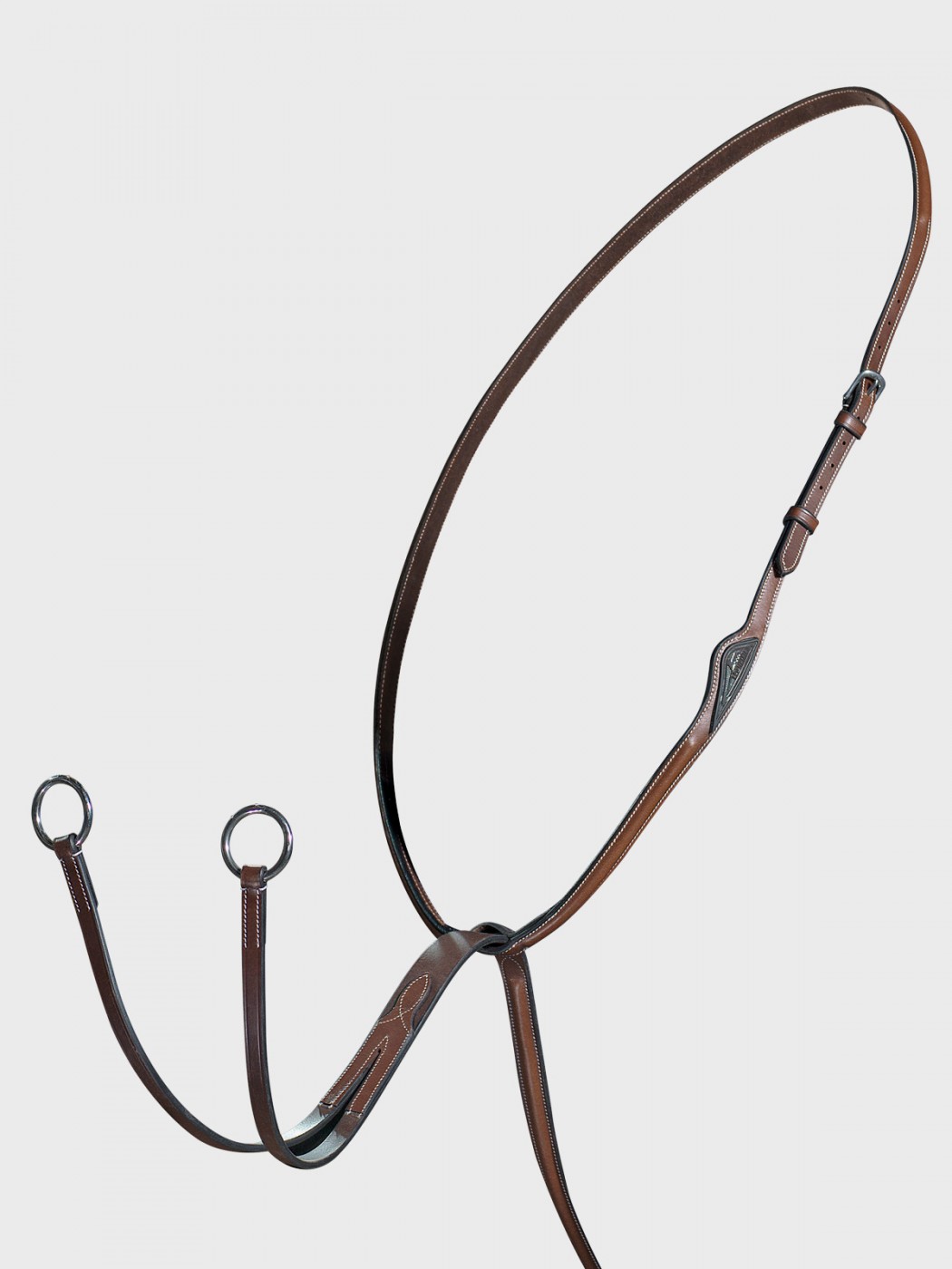 Martingale à anneaux en cuir avec bouclerie en acier inoxydable.