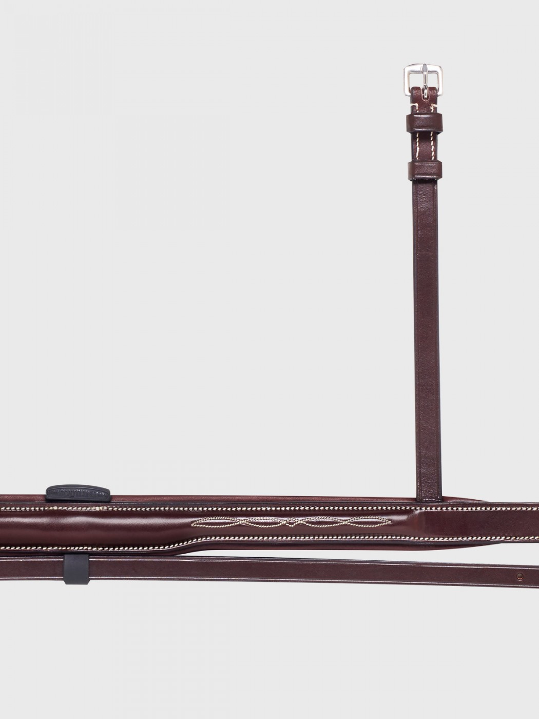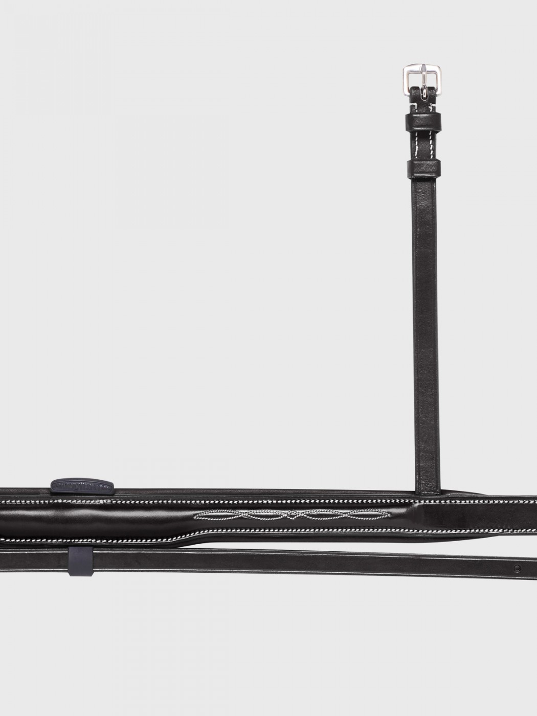 Muserolle élégante avec boucle en caoutchouc amovible pour le passage du noseband. Présente un détail en coutures contrastées et une partie plus large au centre assorties au frontal BB0418. Légèrement rembourrée pour plus de confort. Disponible en noir et en marron, tailles cob et cheval.