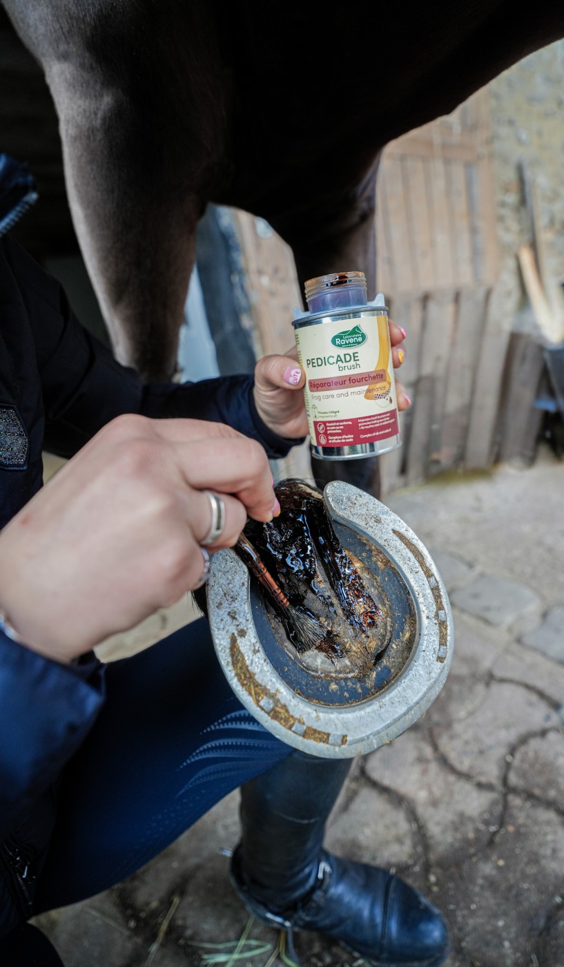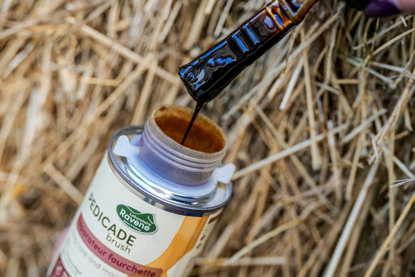 PEDICADE brush peut s’appliquer sur des fourchettes déjà humides et altérées (contrairement au goudron qui ne doit s’appliquer que sur fourchettes sèches et saines !)