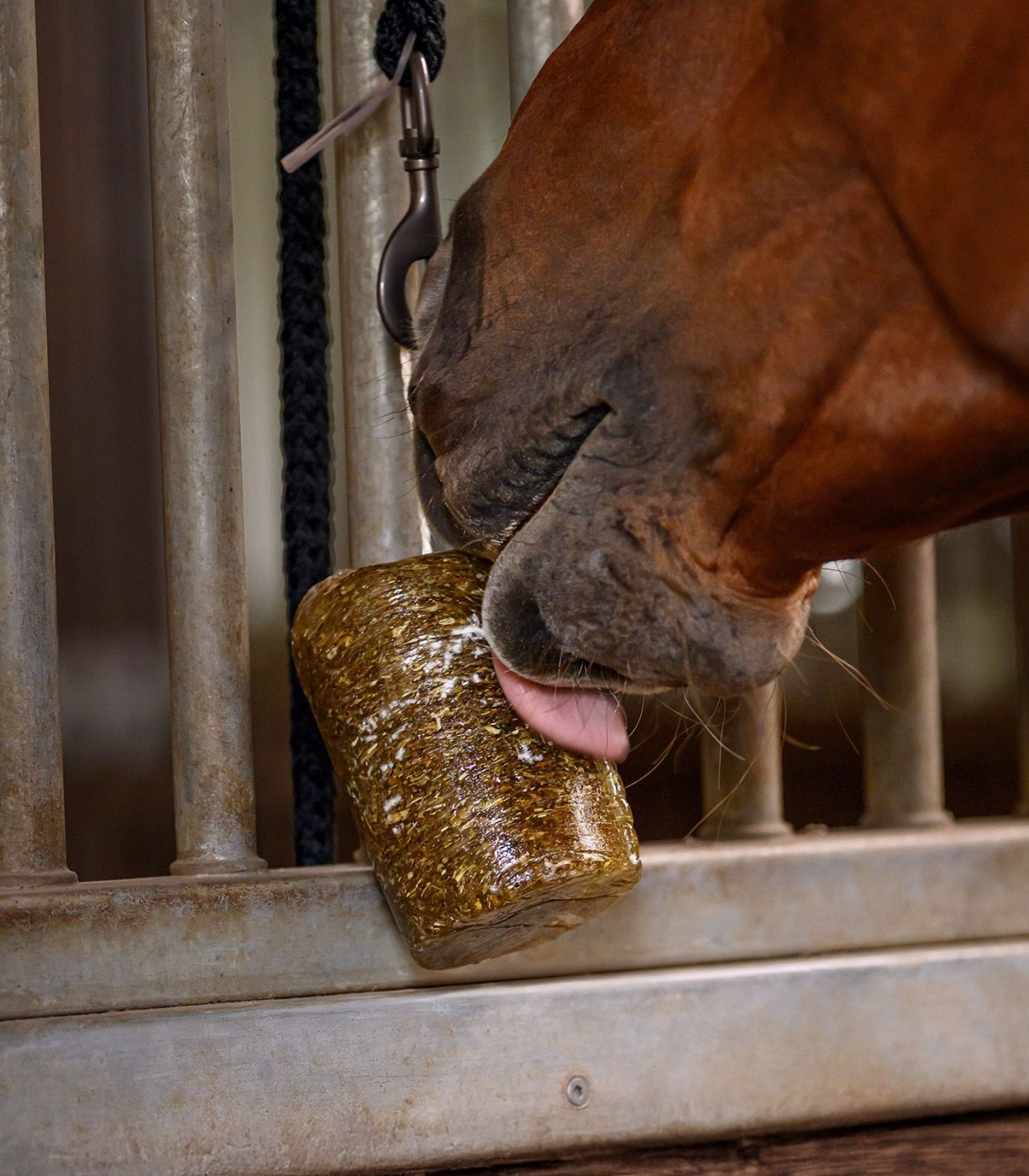 La pierre à lécher doit pendre librement afin d’éviter que le cheval ne la morde et ne consomme le produit trop rapidement.