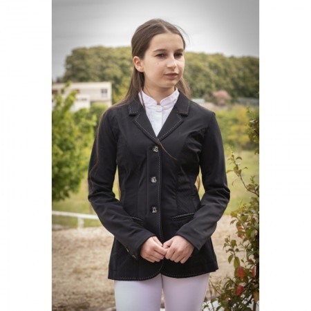 Elle est à la fois très féminine et technique. Un élégant point sellier est cousu le long de la boutonnière, sur le col et à l'arrière des bras. Deux fentes à l'arrière augmentent l'aisance et dessinent une jolie ligne de dos. Pour la fermer, trois boutons de nacre sur le devant et deux à chaque extrémités des manches.
